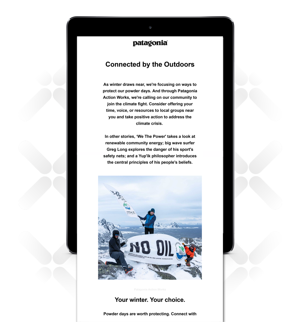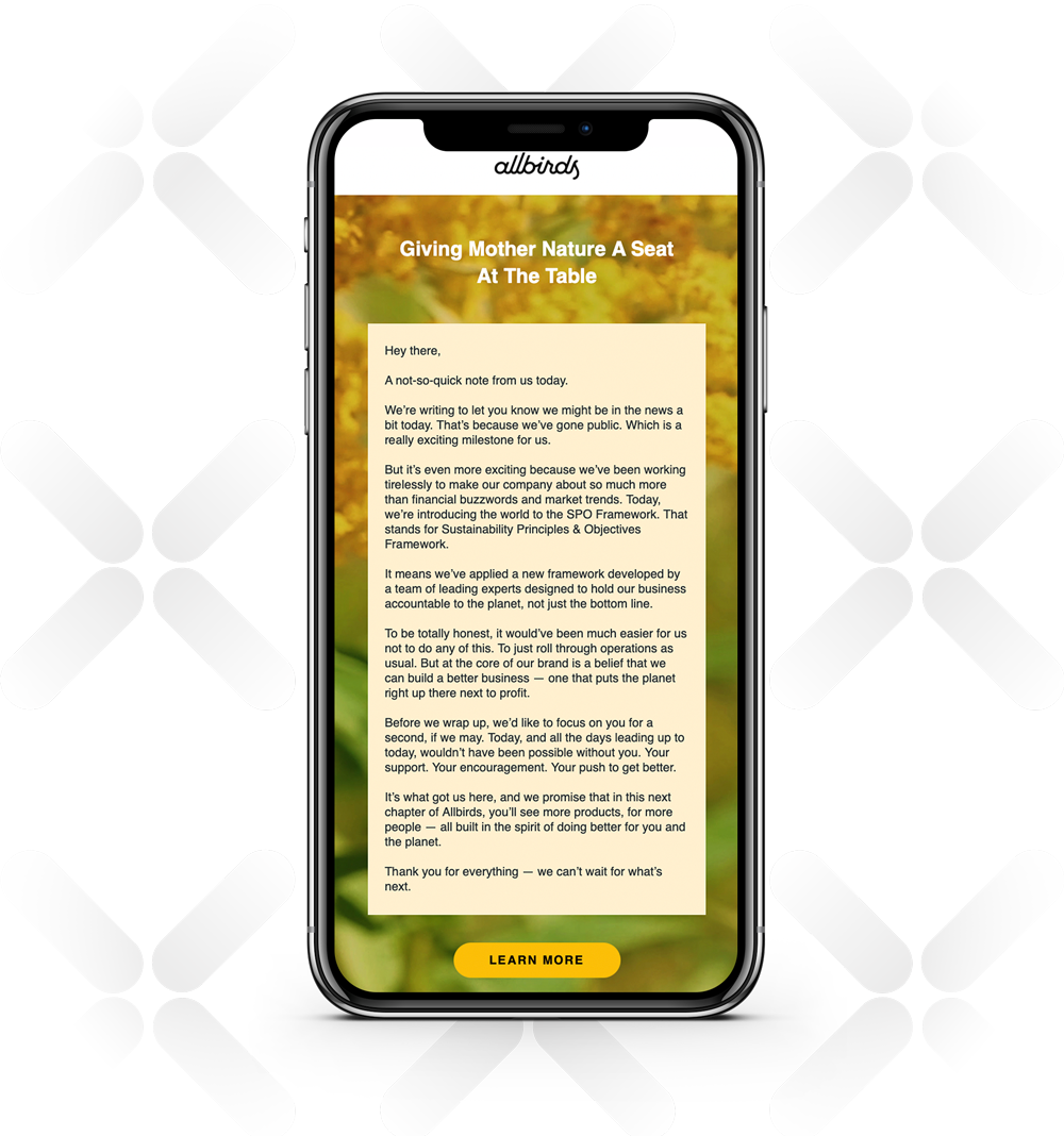 Sustainable clothing company Allbirds was unapologetic in sending a longer-than-usual email setting out its Sustainable Principles and Objectives Framework. This demonstrated its respect for customers' intelligence and values. The company also weaves in its commitment to health by providing valuable background research in editorial emails and restating its sustainability and health commitments in product-driven communications.