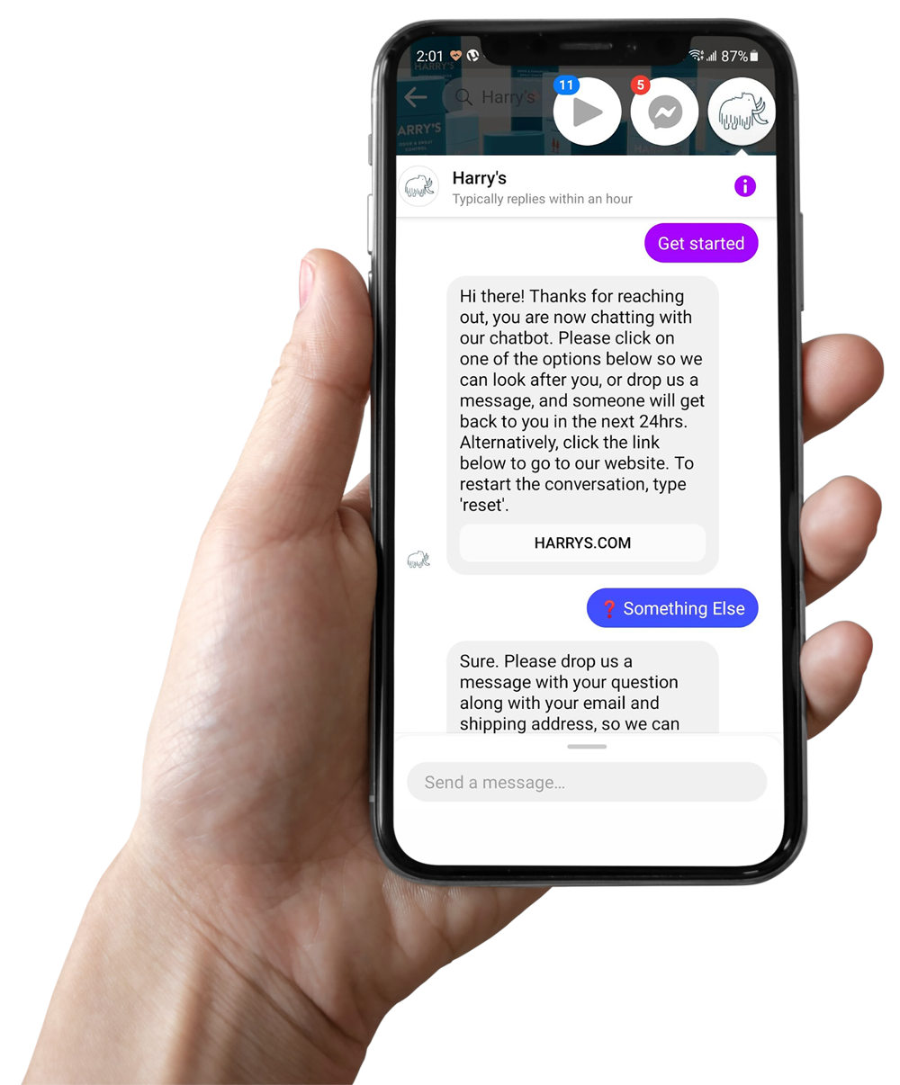 Harry’s was transparent in its online chats, which included a Facebook option. It explained that it was using a chatbot but promised an answer to visitor questions within 24 hours.