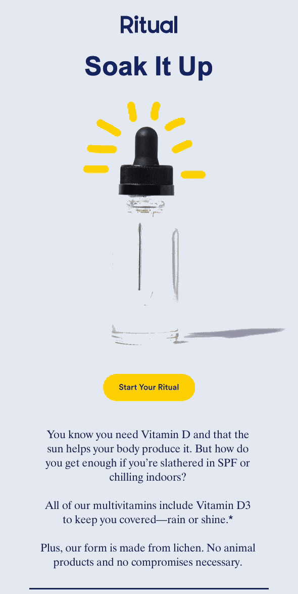Ritual took a smart approach to its email campaigns, using GIFs to help showcase the Ritual journey for customers. Its use of dynamic images in its communications helped to set its emails apart from others.