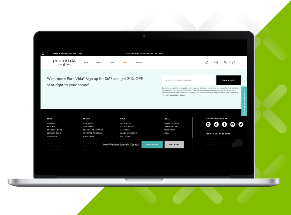 Pura Vida highlighted SMS front and center in its signup CTA, offering a 20% discount coupon sent to the user's phone. This gave it a future option to use texts for promotional messaging and triggered automations. It used smart design to display succinct, clear terms and conditions that would not distract or dissuade site visitors.