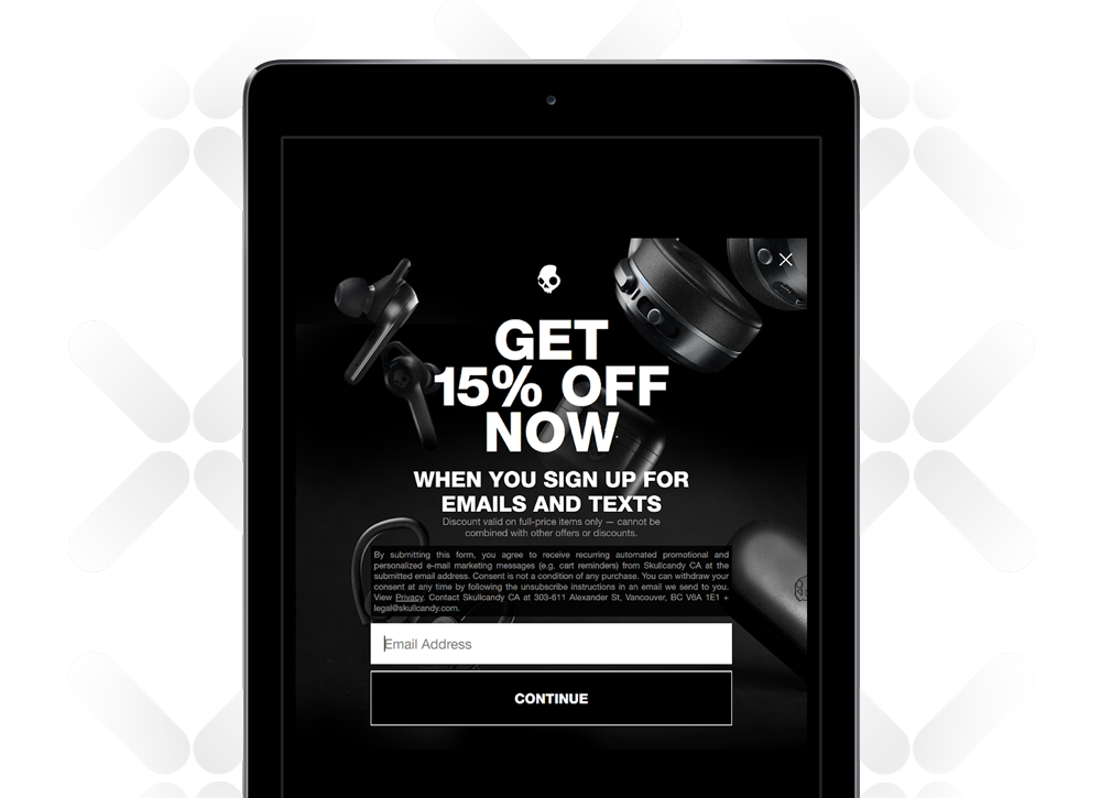 SkullCandy prioritized SMS messages in its signup CTA, sweetening the deal with a 15% discount and gaining permission to use a high-engagement channel from the beginning of its relationship with a subscriber. It highlighted both email and text signup buttons on the same page.